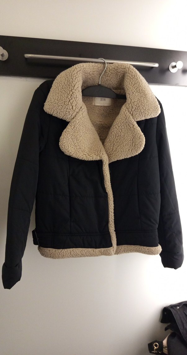 Siyah, kürklü fleece astarlı, normal uzunlukta, gençlere uygun, fitted kesim kadın kış montu. Notched lapel yaka ve strappy kolludur. Small bedenler çok rahat giyebilir iki kere giyildi.