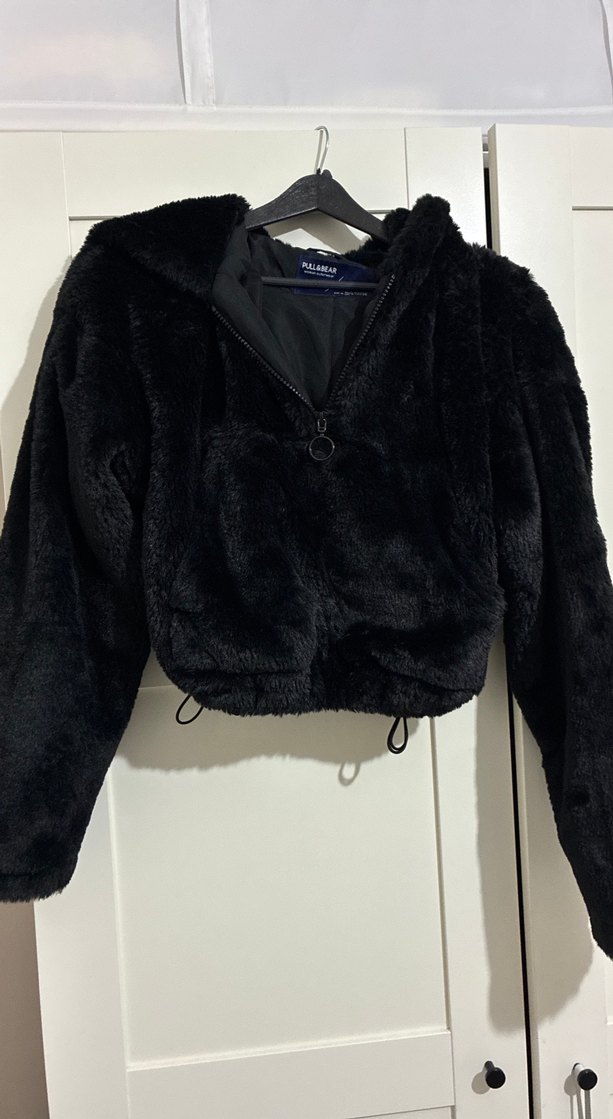 Siyah, kürklü detaylı, yüksek yakalı ve uzun kollu, rahat kesim kadın mont. Günlük kullanıma uygun, desensiz tasarım.