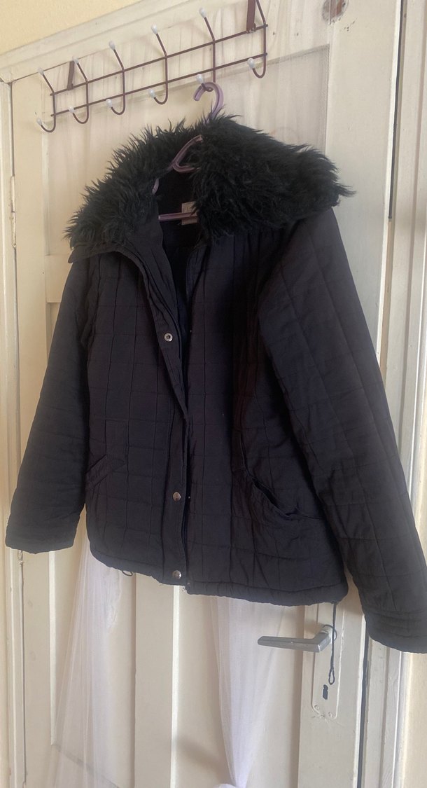 Siyah, kürklü yakalı, dar kesim kadın mont. Uzun kollu ve yumuşak, sıcak tutan kumaştan üretilmiştir. Günlük kullanım için uygundur. Fermuarın ucundaki halka yok sadece fermuar kapanıyor