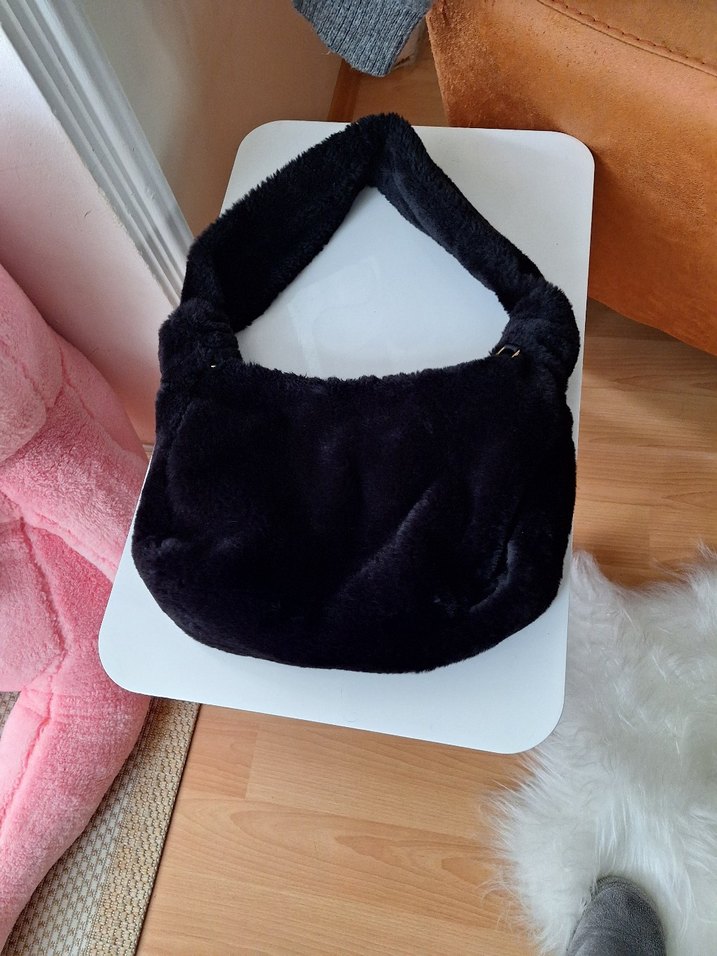Siyah renkte, yumuşak tüylü kumaştan yapılmış kadın omuz çantası. Düz ve gotik tarzıyla günlük kullanıma uygundur.