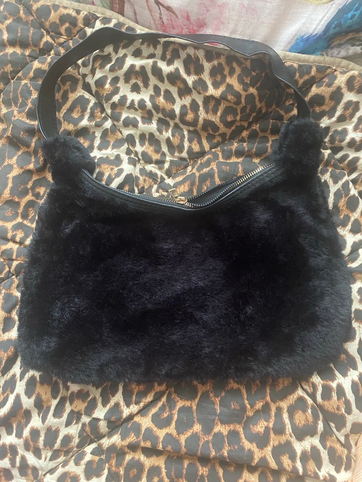 Siyah kürklü detaylı, sentetik kumaş askılı kadın omuz çantasıdır. Rahat, gotik ve bohem tarzlarıyla uyumludur.