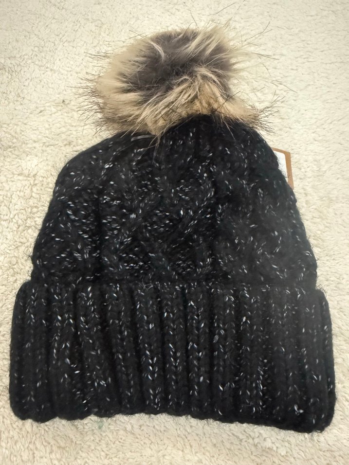 Siyah örgü bere, kürklü ponpon detayı ve kalın ribanalı manşeti ile rahat ve şık bir sokak tarzı sunar. ❄️
