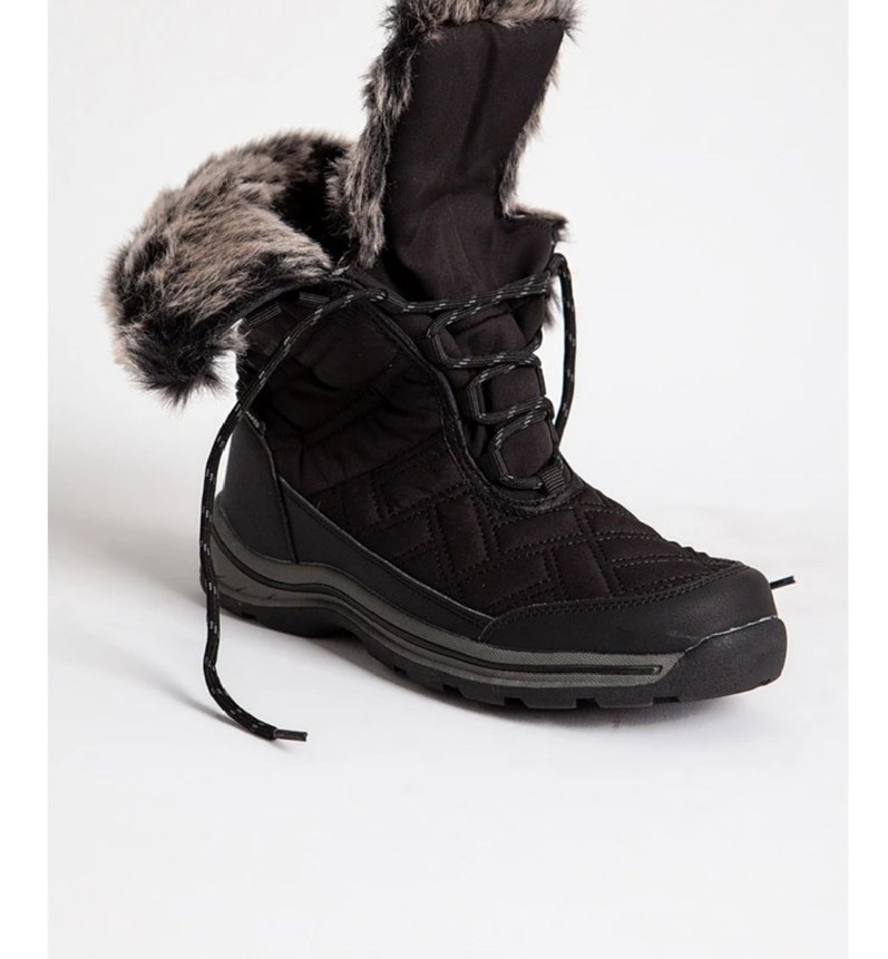 Siyah renkte, kürklü detaylara sahip kadın outdoor botları, dayanıklı kauçuk malzeme ve dolgu topuk ile rahatlık sağlar 38 numara kalıbı yarım numara geniş sorunsuz temiz.