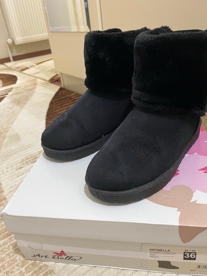 Siyah, kürklü detaylı, Ugg kadın botları. Yumuşak ve sıcak tutan kumaştan üretilmiştir, günlük sokak stiline uygundur. Numara 36. Flo’dan alınmıştır. Markası Art Bella. (2 veya 3 kez giyildi çok kullanılmadı temiz üründür)