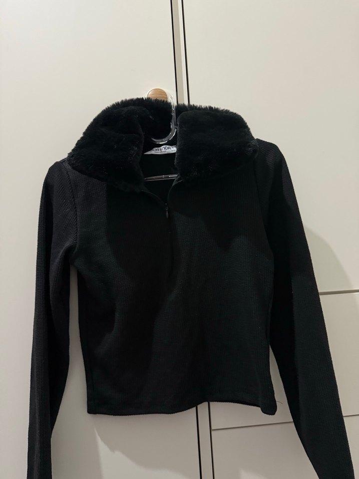 Fitted kesim siyah kadın kazağı, kürklü yakası ve uzun kolları ile yumuşak, sıcak kumaştan üretilmiştir. Rahat goth tarzı için uygundur.