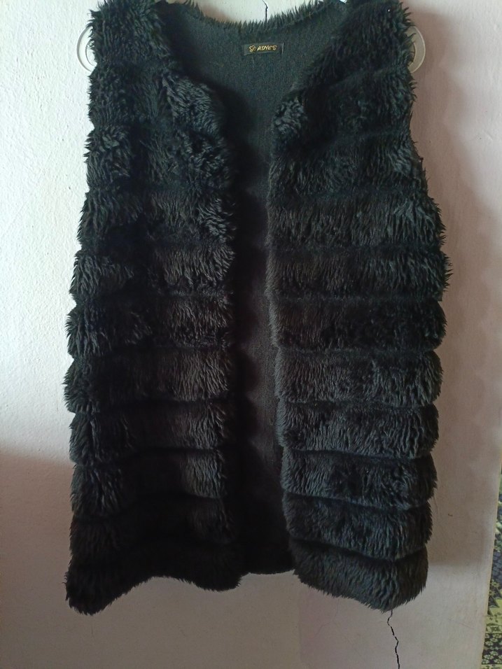Siyah, kolsuz, vücuda oturan, yumuşak sentetik kürk detaylı, yüksek yakalı ve midi uzunlukta kadın yelek.