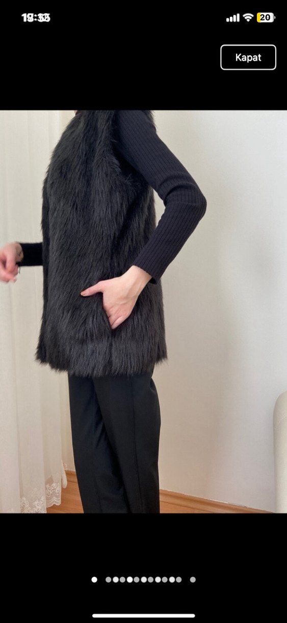 Yüksek yakalı, kürklü detaylı, vücuda oturan kadın yeleği. Yumuşak sentetik kumaştan, midi boy ve kolsuz tasarım, günlük kullanıma uygun koyu gri renk 2-3 kez giyildi kusursuz tertemizdir.