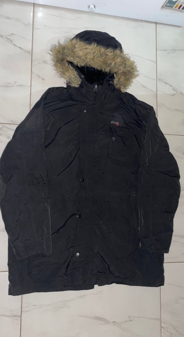 Siyah renkli, kürklü kapüşonlu ve uzun kollu erkek mont. Yumuşak ve sıcak kumaştan, dar kesim, günlük sokak stili için uygun.