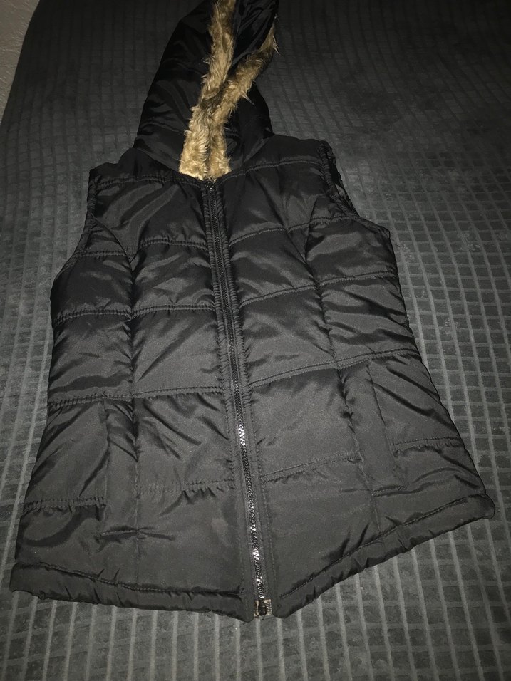 Kürklü kapüşon ve yakalı, siyah renkli, kolsuz, midi boy, dar kesim kadın yelek. Fermuarlı ve günlük sokak tarzına uygun.