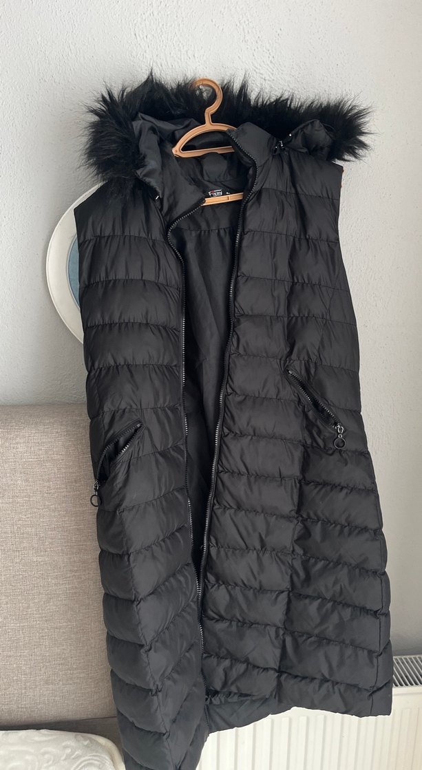 Siyah, kapüşonlu, kürklü detaylı, yüksek yakalı ve belden oturan midi uzunlukta kadın yelek. Sokak stiline uygun, cepli ve kolsuz tasarım.