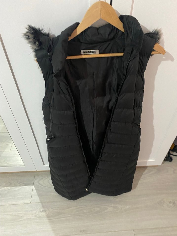 Siyah renkte, kapüşonlu ve kürklü detaylara sahip, yüksek yakalı, kolsuz ve dar kesim kadın yelek. Rahat ve şık bir dış giyim parçası. 38-40 beden sadece şapkasında küçük bir yırtık var