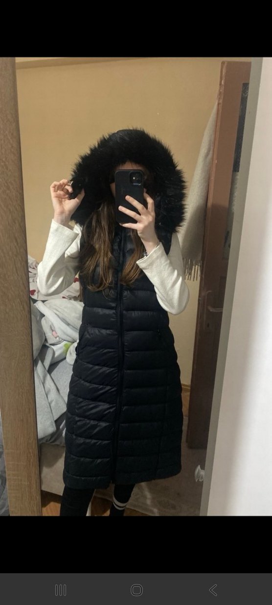 Siyah, kürklü kapüşonlu ve yüksek yakalı, ince kesim kadın yelek. Yumuşak ve sıcak kumaştan, günlük kullanıma uygun rahat bir sokak stili sunar.