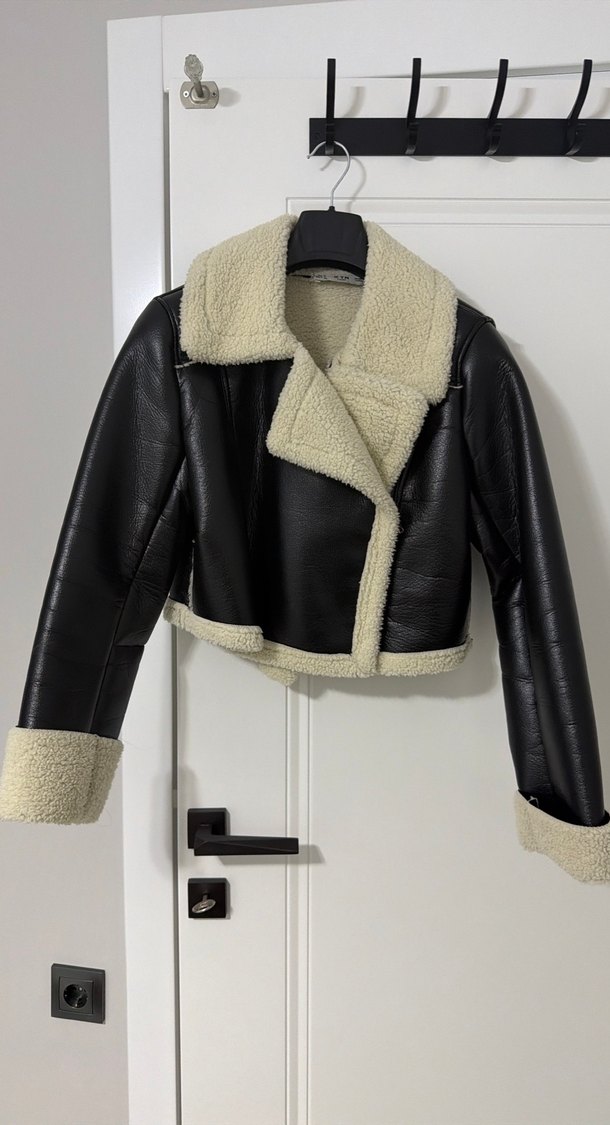 Siyah deri, kürk detaylı, kısa ve dar kesim kadın ceket. Notch yaka, kollar ve etek ucunda sıcak kürk bulunur. Trend sokak stili için uygundur.