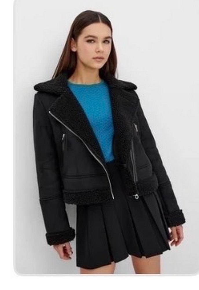 Siyah renkli, kürk detaylı ve kesik yakalı kısa ceket. Uzun kollu, regular fit ve günlük sokak stili için uygun.