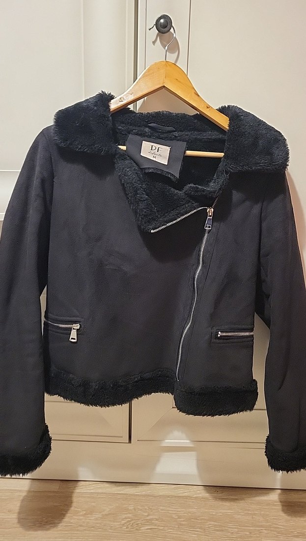 Siyah, kürklü detaylı, kısa kesim ve dar kesim kadın ceket. Notlu yaka ve uzun kollu, rahat ve sıcak kumaşla günlük kullanım için uygundur.
