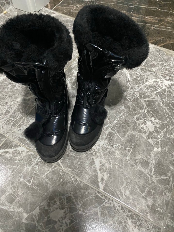 Siyah, kürklü kız çocuk botları. Kauçuk malzemeden, gotik tarzda rahat ve şık günlük kullanım için uygun.