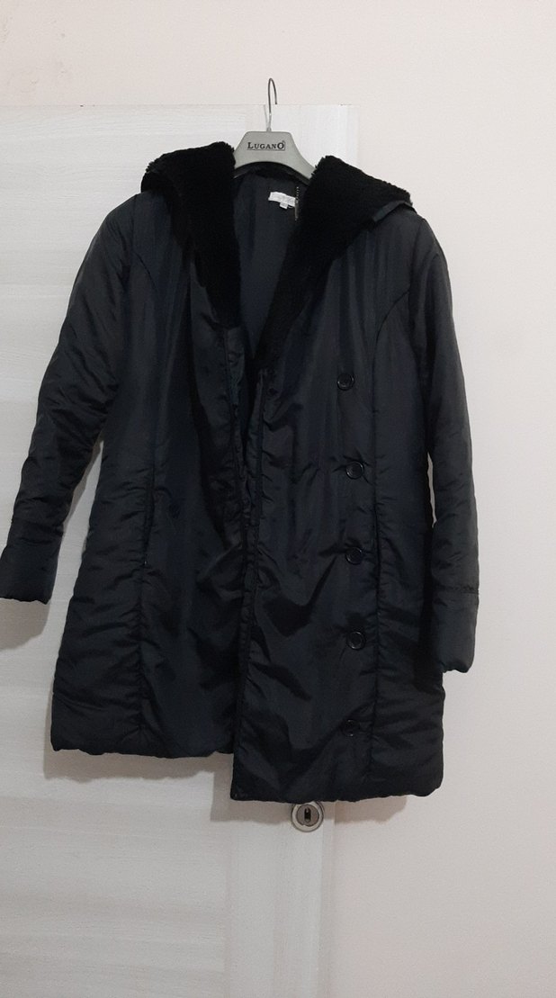 Uzun kollu, siyah kadın ceketi, kürk detaylı ve kesik yaka. Orta boy ve rahat kesim, yumuşak ve sıcak kumaştan yapılmıştır.
