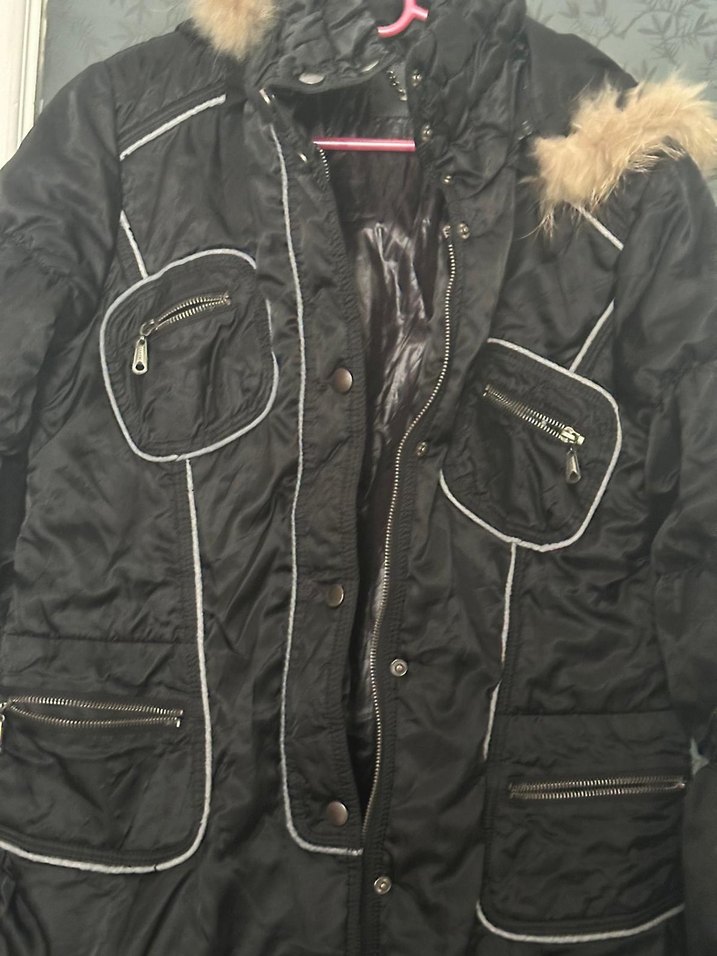 Siyah, kürklü detaylı, normal boy midi kadın ceket. Çıtçıt ve fermuarlı çoklu cepleri, kesimli yakası ve askılı kolları bulunur.