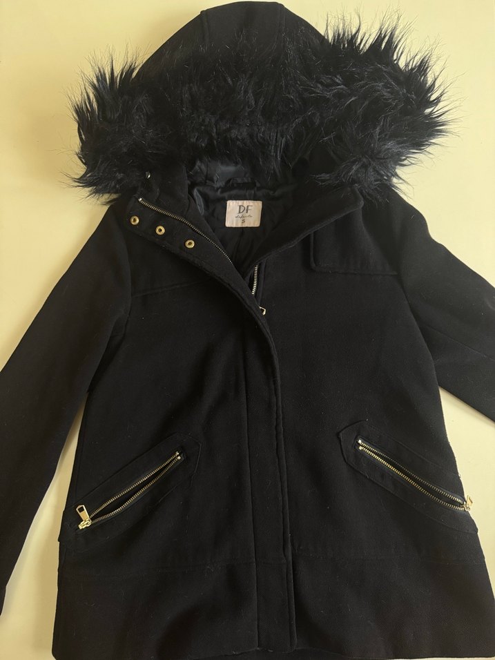 Siyah, kürklü kapüşonlu ve uzun kollu, diz hizasında, yumuşak ve sıcak dokulu kadın ceketi. Fermuarlı cepleri bulunur, gündelik kullanım için uygundur.
