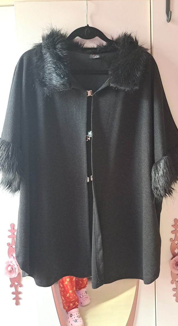 Geniş kesim siyah kaban, kürklü yakası ve kısa kollarıyla dikkat çeker. Parlak kumaşı ve gotik tarzıyla öne çıkar.