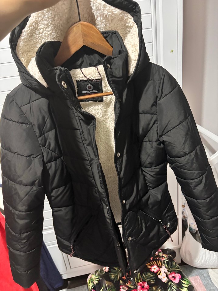 Fıt kesim siyah kışlık mont, kürklü ve fleece astarlı. Notch yakalı, askılı kollu, midi boyda, günlük kullanıma uygun.