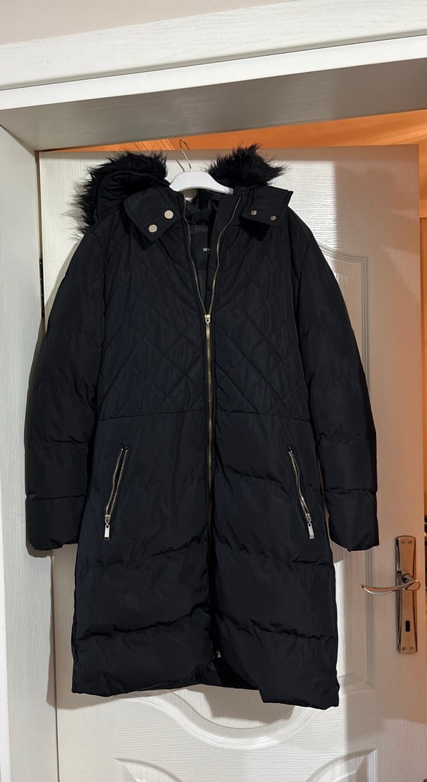 Siyah, kürklü kapüşonlu, normal uzunlukta ve fermuarlı cepli, rahat ve yumuşak dokulu, ince kesim midi kadın monttur. 90 cm iki kol arası 50 cm