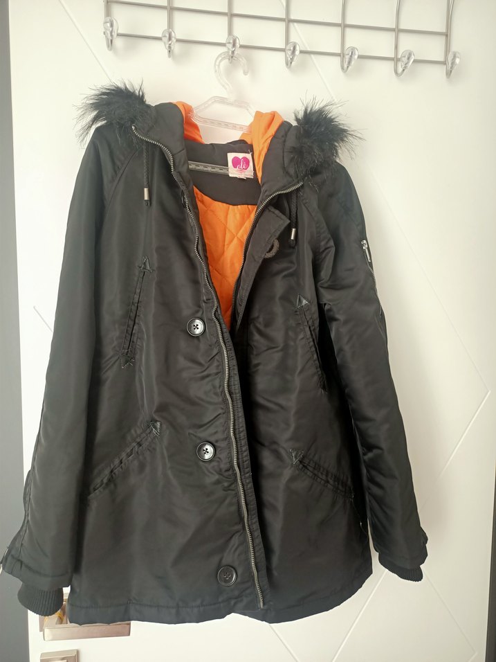 Siyah, kürklü kapüşonlu ve keskin yakalı, uzun kollu, midi uzunlukta, yumuşak kumaştan kadın montu. Turuncu astar içerir, dış mekan için uygun.