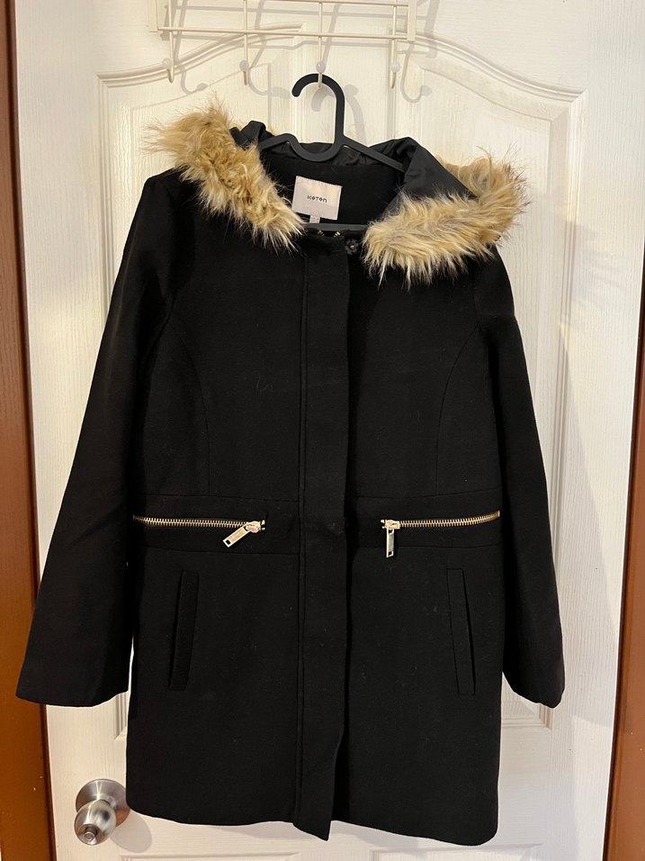 Siyah, kürklü kapüşonlu, normal boy, kadın kışlık mont. Sokak modasına uygun, rahat ve sıcak tutar.