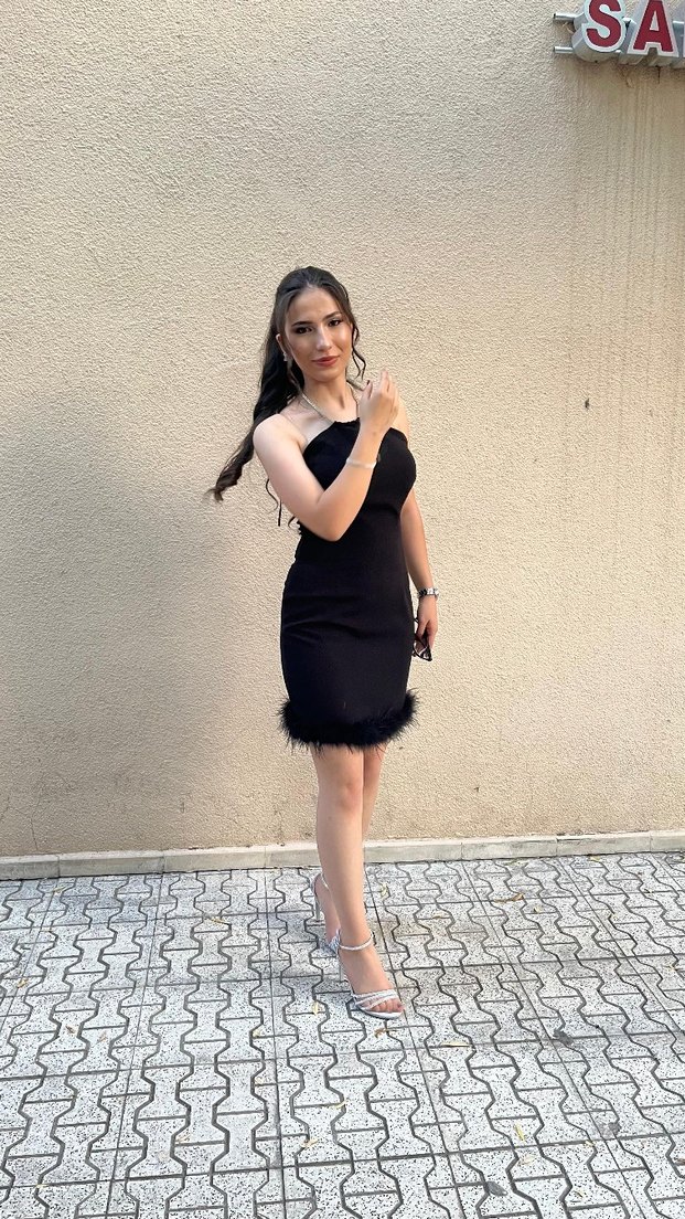 Siyah, mini, straplez kesim, kürk detaylı ve dar kesim abiye elbise. Gotik tarzda, cesur bir görünüme sahiptir.