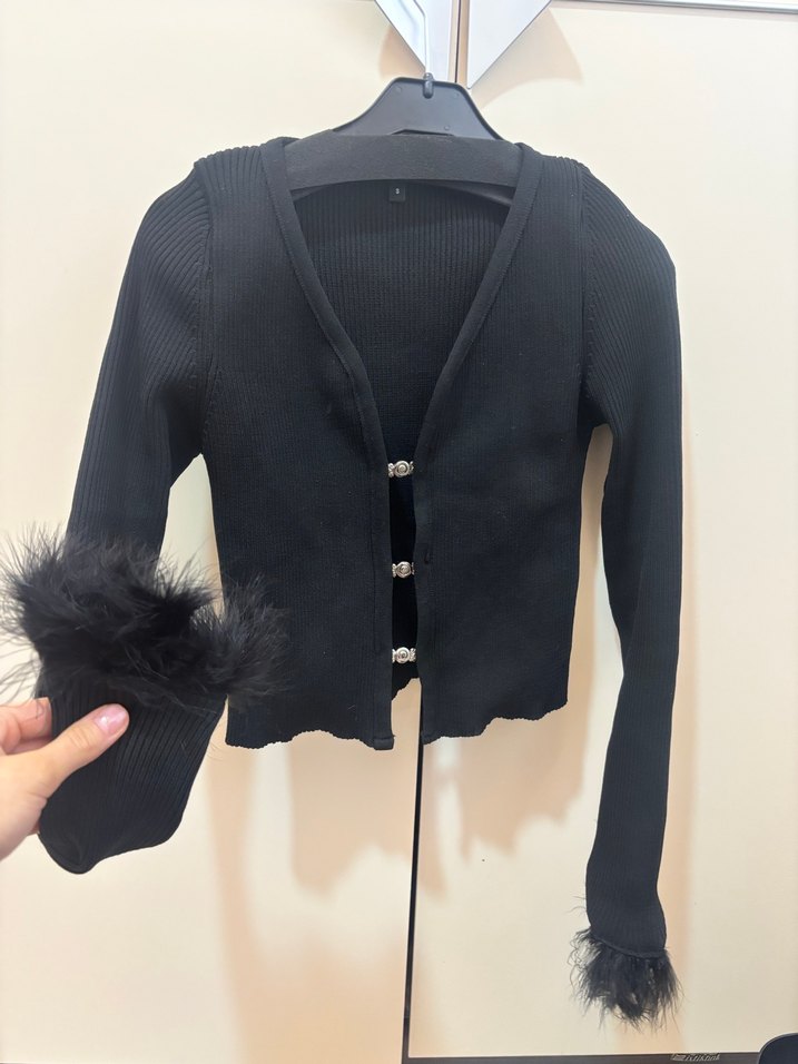 Siyah, kısa kesim ve fitted triko hırka, uzun kolları kürk detaylıdır. Yaka tipi notched lapel olup desensizdir.