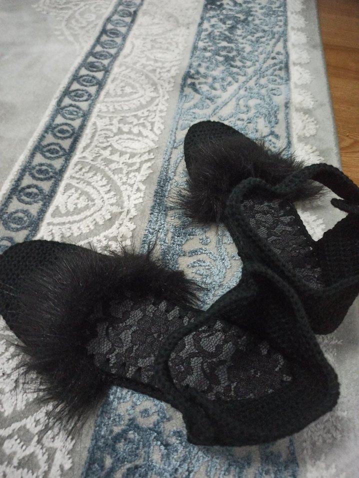 Nakışlı desenli, kürklü detaylı siyah örgü kadın espadril. , rahat ve gotik tarzda günlük kullanım için uygun.
