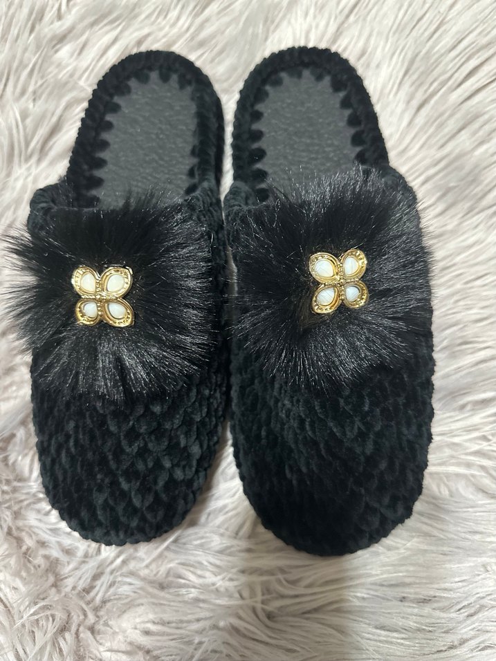 Siyah Kürklü Nakışlı Kadın Ev Terliği