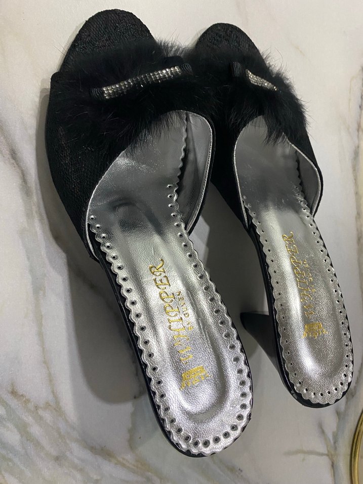 Kadın terlikleri, stiletto topuklu ve desenli siyah kauçuk malzemeden, kürk detaylıdır. Parlak yüzeye sahip olup klasik ve zarif bir stilde, görselde görüldüğü gibi tertemiz sıkıntısız terlik