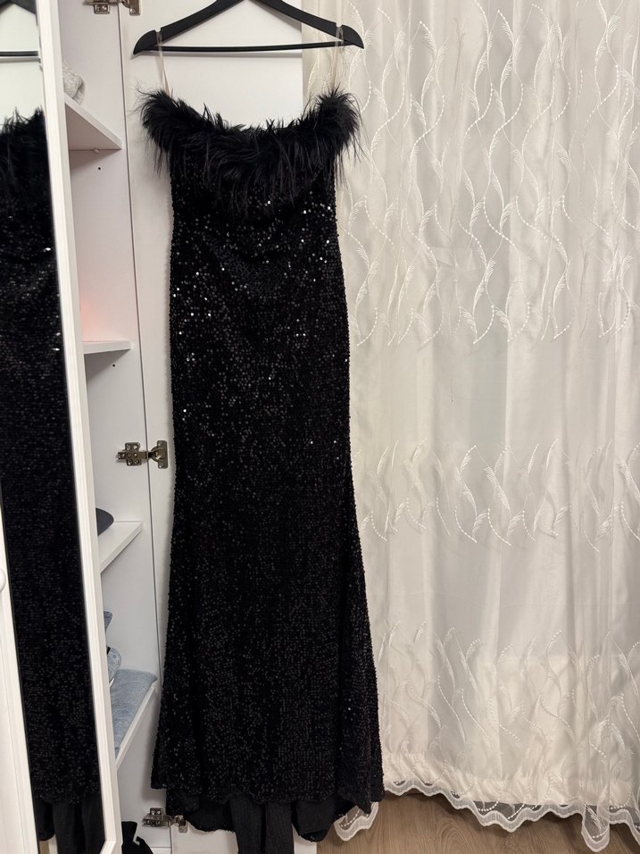 Siyah, kürklü detaylı, uzun ve vücuda oturan abiye elbise. Kayık yaka ve kolsuz tasarımıyla partiler için uygundur. ✨