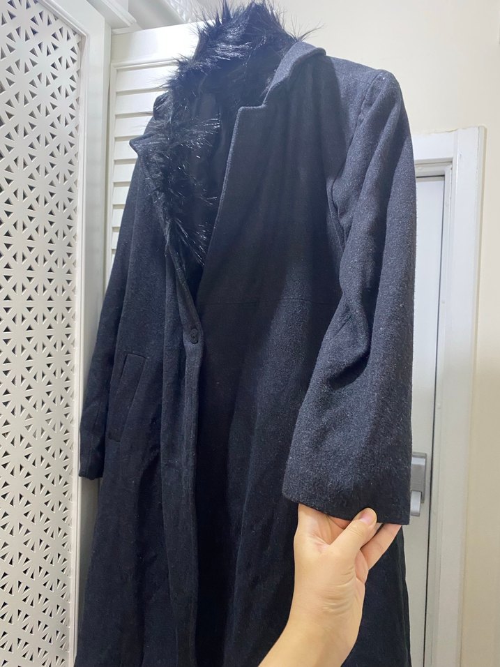 Yumuşak kürk detaylı siyah uzun kaban, düğmeli kapama ve yan ceplerle. Sıcak ve rahat hissettiren kumaş.