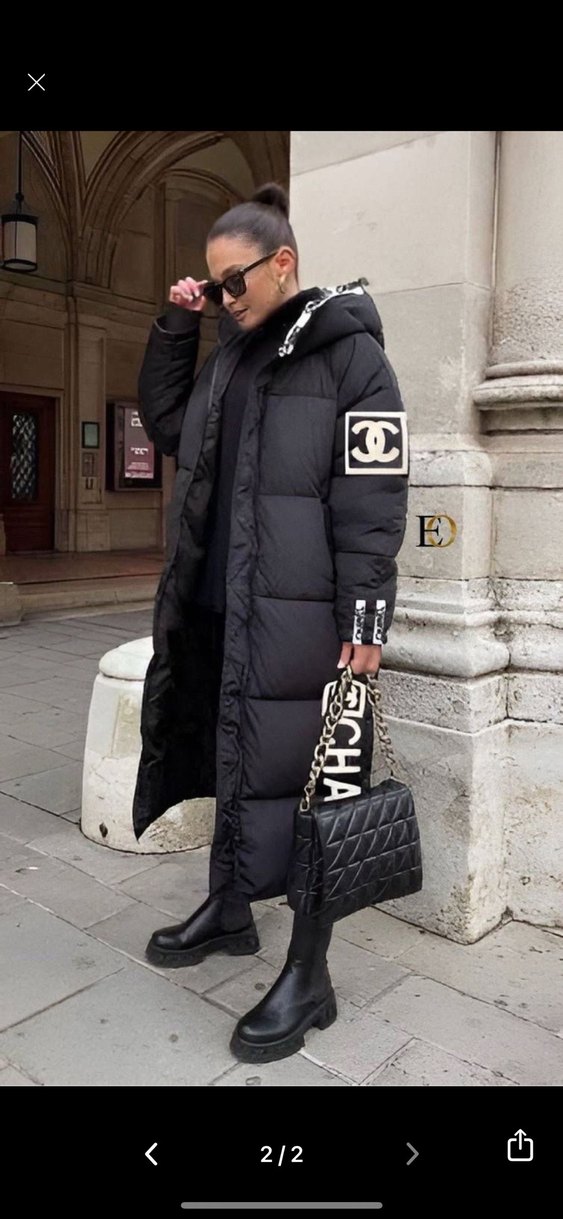 Siyah, kürklü detaylı, uzun ve fitted kesim kadın kışlık mont. Notch yakalı, desenli ve askılı kollu, günlük sokak stili için uygun.