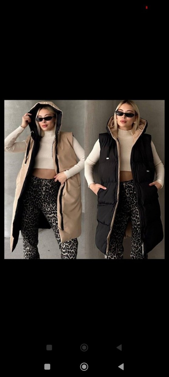 Siyah renkte, uzun ve bol kesim kadın yeleği, straplez yaka ve kürk detaylarına sahiptir. Kolsuz ve yumuşak, sıcak tutan kumaştandır, günlük kullanım için uygundur.