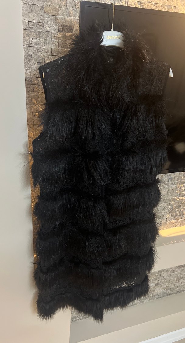 Butik ürünüdür Hiç deformesi yok Orijinal markasının modelidir Kıyamıyorum satmaya ama dolapta yer yok Siyah, desenli ve sentetik kumaştan üretilmiş, kürk detaylı, yüksek yakalı, uzun ve fit kesim kadın yelek. Goth tarzında, parti için uygun.
