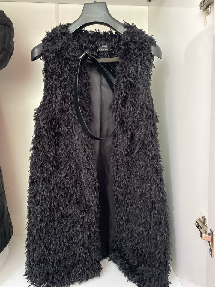 Fitted kesim, uzun siyah yelek, halter yaka ve kürklü detaylara sahiptir. Yumuşak sentetik kumaştan üretilmiştir, kolsuz ve içi astarlıdır. Rahat ve gotik tarz için uygundur. Kemerde dahildir