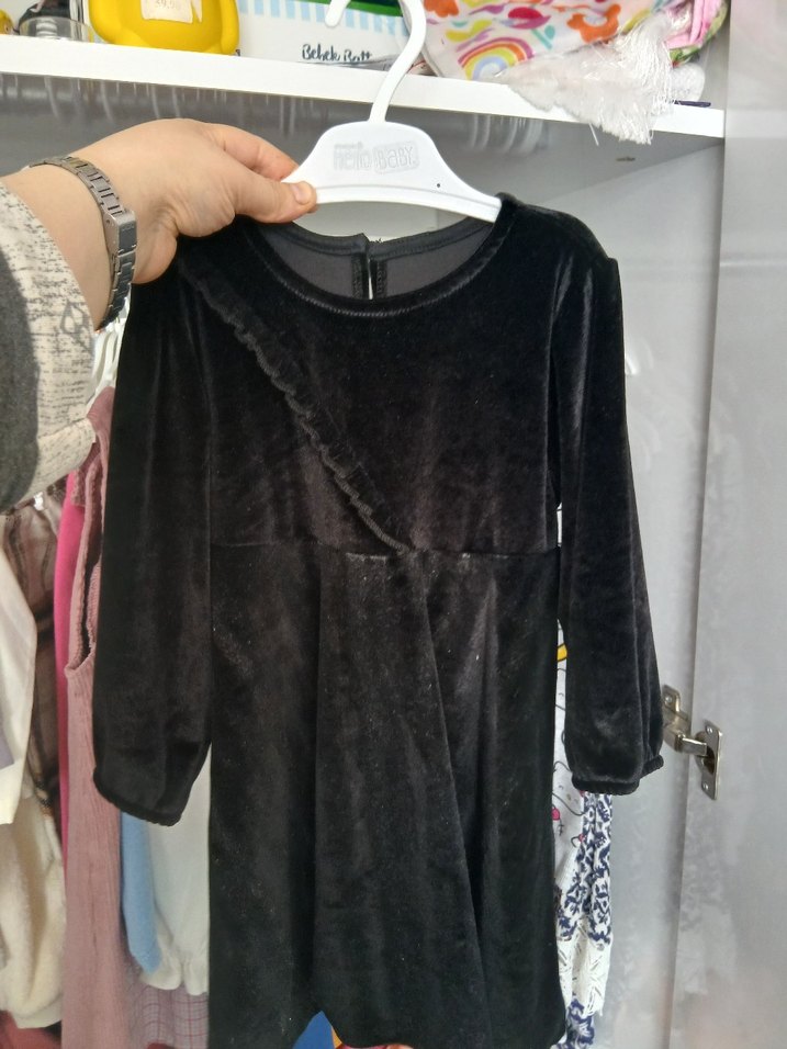 Siyah renkte, uzun kollu ve yuvarlak yakalı kız elbisesidir. Yumuşak kumaştan yapılmış, kürk detaylı ve hafif batik desenlidir. Trendy ve rahat bir tarza uygundur.