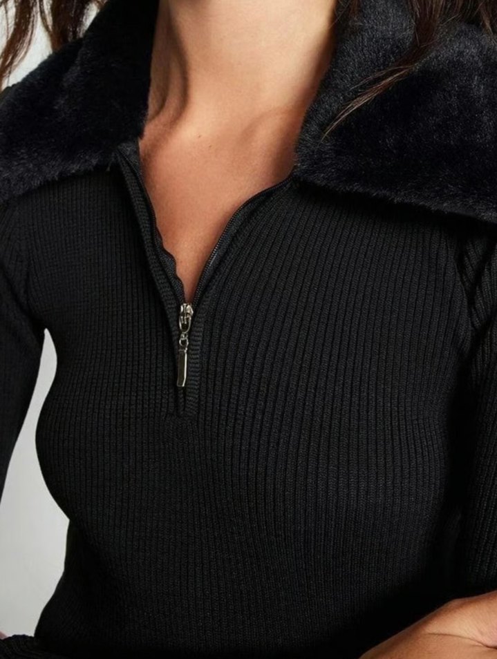 Siyah, kısa kesim, uzun kollu ve V yakalı kadın kazağı, kürk detaylı yakasıyla rahat ve şık bir goth tarz sunar.