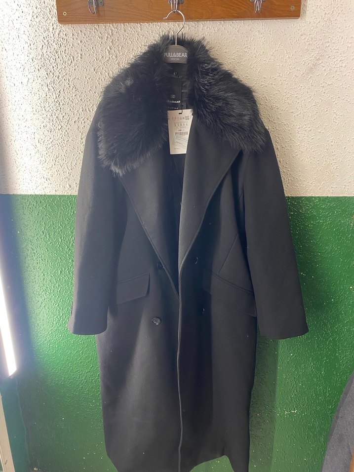 Yumuşak ve kalın kürklü yakaya sahip siyah uzun kaban, çift düğmeli ön tasarım içi astarlı. S beden