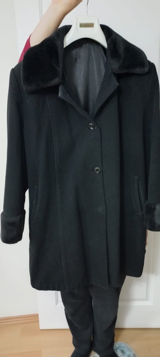 Yumuşak kürklü yaka ve manşetlere sahip siyah kaban, düğmeli kapama ve yan cepler içerir. Soğuk havalar için sıcak ve klasik bir stil sunar.