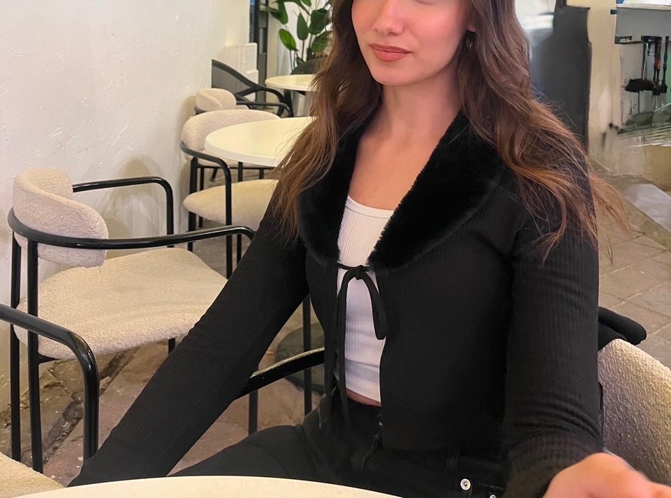 Bu siyah, kürklü yakalı ve uzun kollu kadın kazak, fitted kesime ve midi boy uzunluğa sahiptir. Desensiz, rahat ve ofis için uygundur.