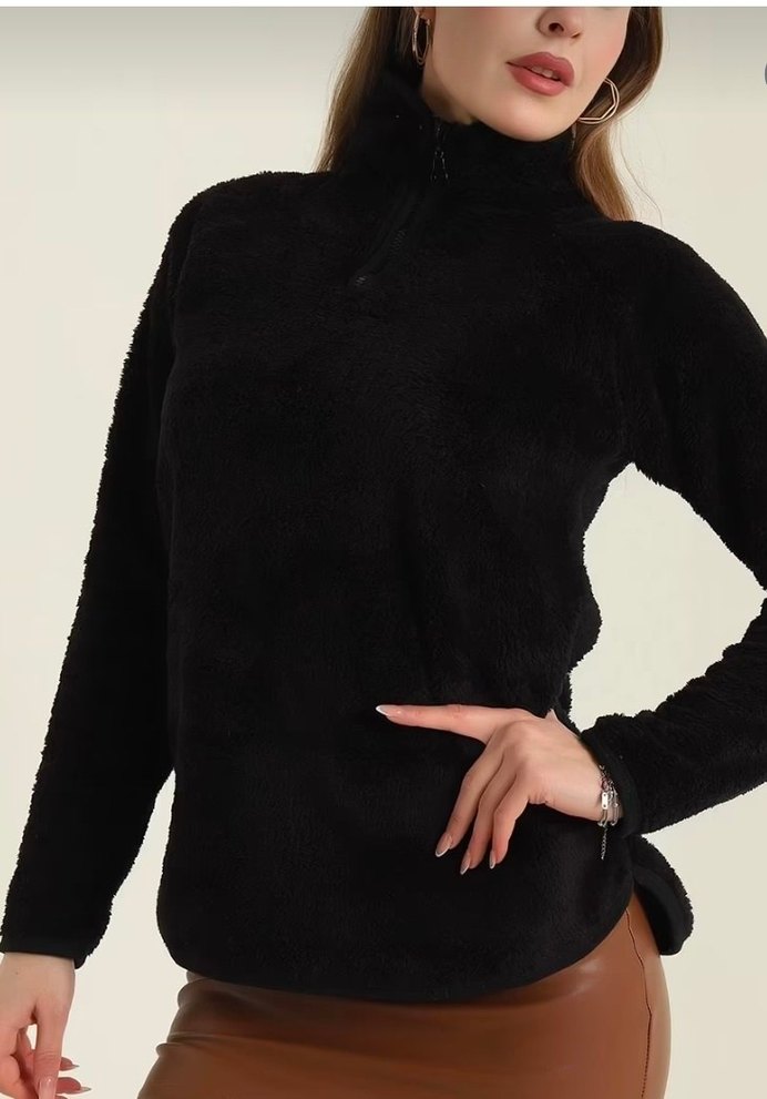 Siyah, yarım balıkçı yaka ve uzun kollu kadın kazak. Kısa ve vücuda oturan kesimi, kürklü detaylarıyla rahat ve sıcak kumaştan üretilmiştir.