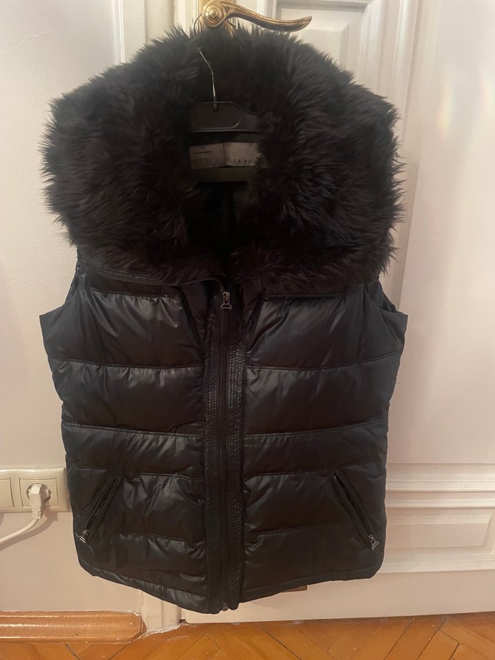 Siyah, kürklü yakalı, belden kemerli, midi boyda kadın yeleği. Rahat sokak stili için uygundur.