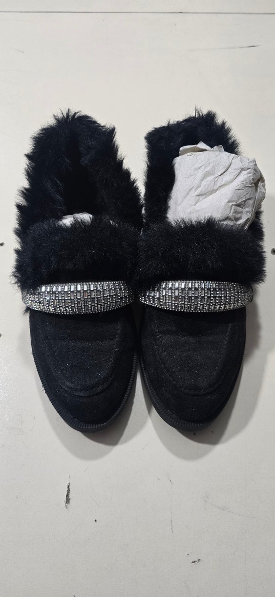 Yumuşak kürklü, taş detaylı siyah yüksek topuklu kadın terlik. Sıcak ve rahat kumaştan, günlük kullanıma uygun goth tarzda.