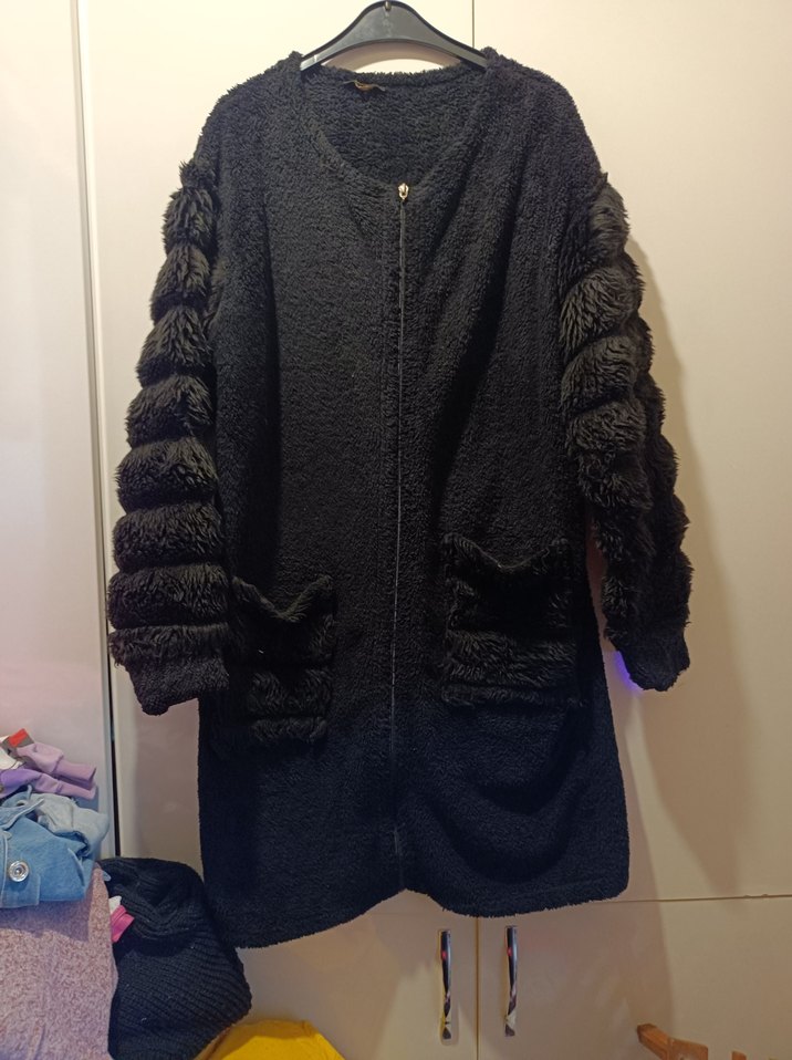 Uzun kollu, kruvaze yaka, siyah yün kaban, kürk detaylı kollar ve ceplerle, rahat kesim ve midi boyda, günlük kullanıma uygun.