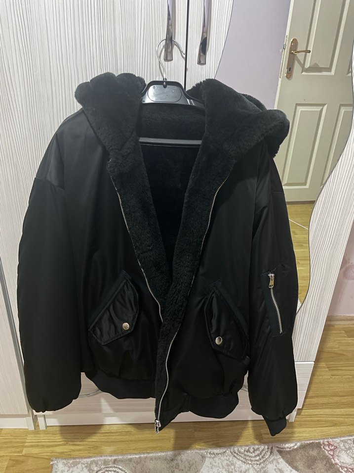 İki taraflı da giyilebiliyor kürk mont şeklinde tertemiz ürün sol iç cebinde küçük bir delik var onun dışında kusursuz