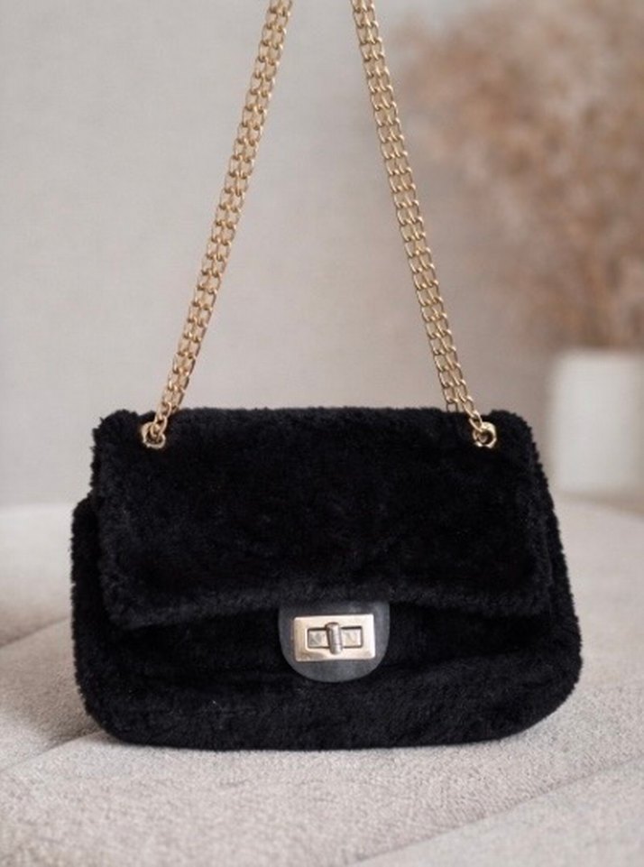 Siyah, kürklü detaylı dış yüzey, altın zincir askılı çanta , az kullanıldı. Fotografta küçük çıkmış ama bir iki tık daha büyük reelde.